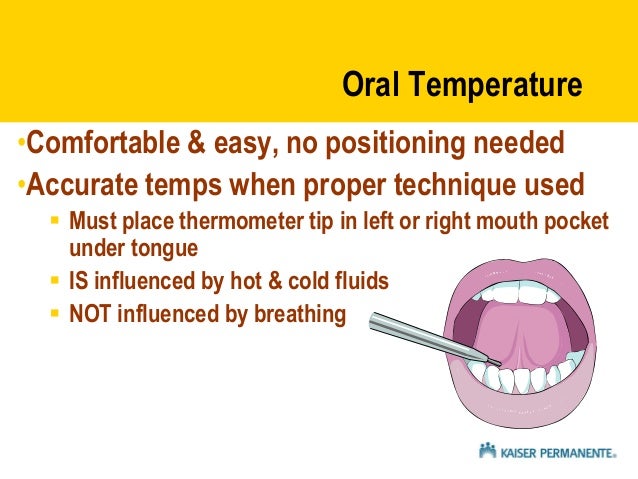 Wait at least 30 minutes to use an oral thermometer if you ve eaten or had something hot or cold. To take an oral temperature put the tip under your tongue as far as it can go. Using the diagram on the right place the probe tip under the tongue as near as possible to the heat pocket the diagram also shows the temperature variables by not placing the tip in the heat pocket area. If you ve been eating or drinking wait 30 minutes before you take a temperature by mouth.